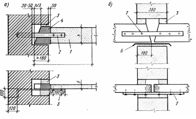 При обпиранні балок на внутрішні стіни (рис.6.2, б) кінці їх антисептують і обертають двома шарами толю. Зазор між балками і стінками гнізд також рекомендується зашпаровувати розчином з протипожежних і звукоізоляційних міркувань.