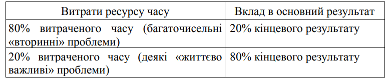 Дію методу В. Парето можна подати у вигляді таблиці 1, де зафіксовано основний принцип часового менеджменту.