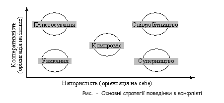 Виділяють 3 основні стратегії, що використовуються в управлінні конфліктом :