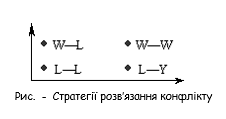 - стратегія «виграти—виграти». Сторона-конфліктер прагне до такого виходу з конфлікту, щоб задовольнити кожного з учасників. Перетворює учасників конфлікту на партнерів. Перевагою цієї стратегії є й те, що вона цілком етична і водночас ефективна.