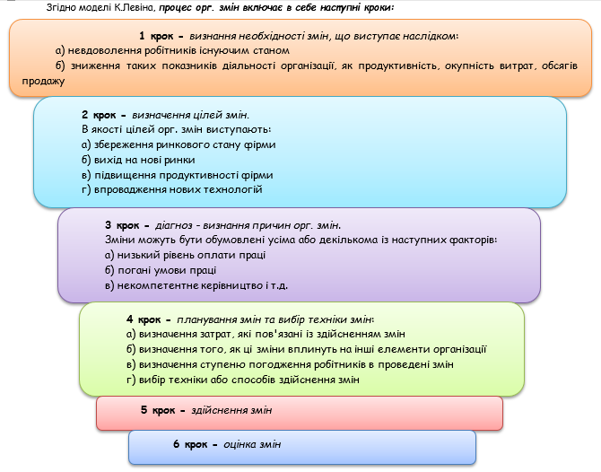 Сутність процесу організаційних змін описується за допомогою моделі К.Левіна, яка включає в себе наступні 3 етапи:
