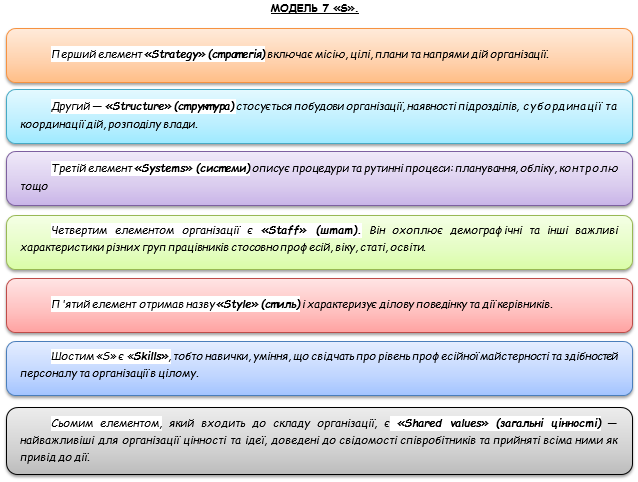 В англійській мові назва кожного з цих елементів розпочинається з літери «S», тому цей підхід більше відомий як МОДЕЛЬ 7 «S»