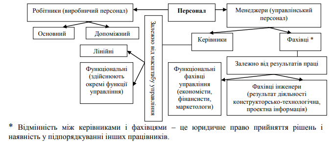 За ознакою участі у виробничому або управлінському процесі, тобто за характером трудових функцій, а отже посади, персонал підрозділяється на такі категорії: