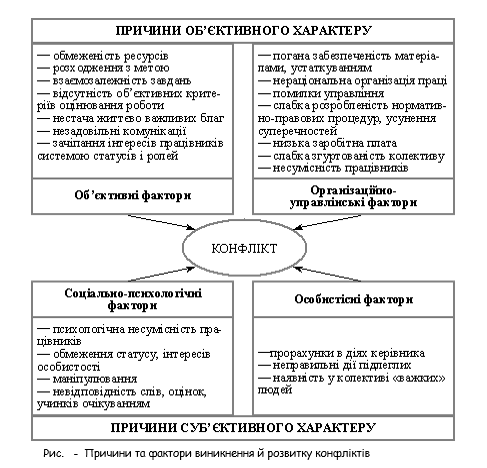 Виникнення та розвиток конфліктів обумовлено дією чотирьох груп факторів: об’єктивних, організаційно-управлінських, соціально-психологічних і особистісних. Перші дві групи факторів носять об’єктивний характер, третя й четверта — суб’єктивний.
