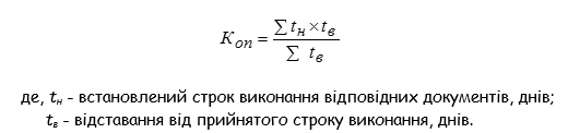 Оперативність роботи апарату управління відображає своєчасність виконання постанов, наказів і розпоряджень вищих організацій, керівників і головних спеціалістів підприємства. Коефіцієнт оперативності (Коп) визначають за формулою: