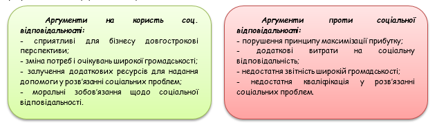 Ставлення до соціальної відповідальності може бути різним: від сприятливого до ворожого. Аргументи за і проти соціальної відповідальності: