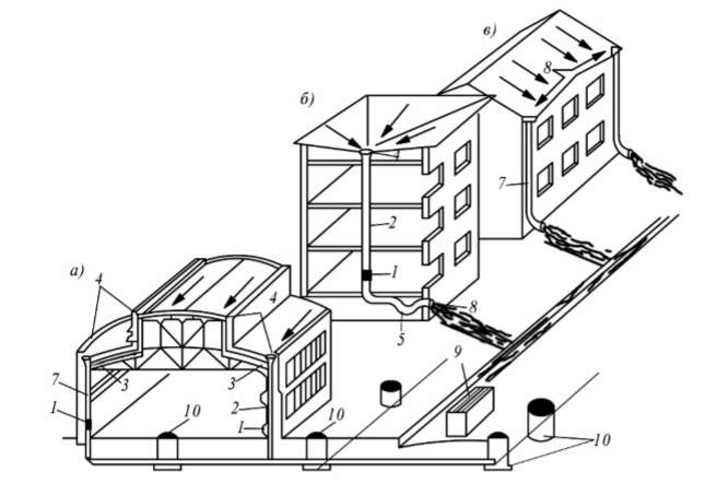 1 – ревізії; 2 – стояк; 3 – відвідні труби; 4 – воронка; 5 – гідрозатвір; 6 – відкритий випуск; 7 – водостічна труба; 8 – жолоб; 9 – дощоприймач; 10 – оглядові колодязі