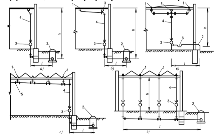 а – система з однією воронкою на стояку; б – система з однією воронкою на стояку та підвісним трубопроводом; в – система з двома воронками, які розташовані симетрично відносно стояка; г – система з декількома воронками і самопливним підвісним трубопроводом; д – система з декількома воронками і самопливним підпільним трубопроводом. 1 – водостічна воронка; 2 – колодязь на випуску; 3 – ревізія; 4–водостічний стояк; 5 – прочистка; 6 – гідрозатвір; 7 – відкритий випуск