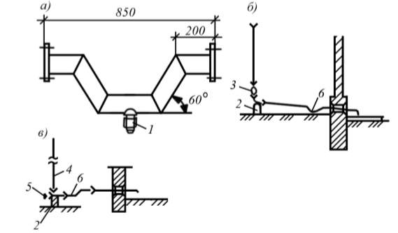 а – загальний вигляд гідрозатвору; б – гідрозатвір на сталевому трубопроводі; в – гідрозатвір із фасонних частин (трійник, відступ): 1 – отвір із заглушкою; 2 – упор; 3 – ревізія; 4 – стояк: 5 – прочистка; 6 – гідрозатвір