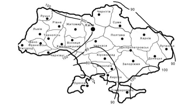 Значення параметру q20 в межах України можливо визначити за рис. 5; значення кліматичного коефіцієнту n при Р=1 рік: для рівнинних областей України n=0,71, для східних – n=0,67, для Чорноморського узбережжя – n=0,62.