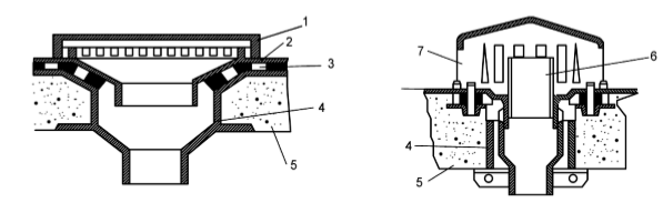 1 – решітка; 2 – рама; 3 – гідроізоляція; 4 – корпус; 5 – перекриття; 6 – переливний патрубок; 7 – ковпак