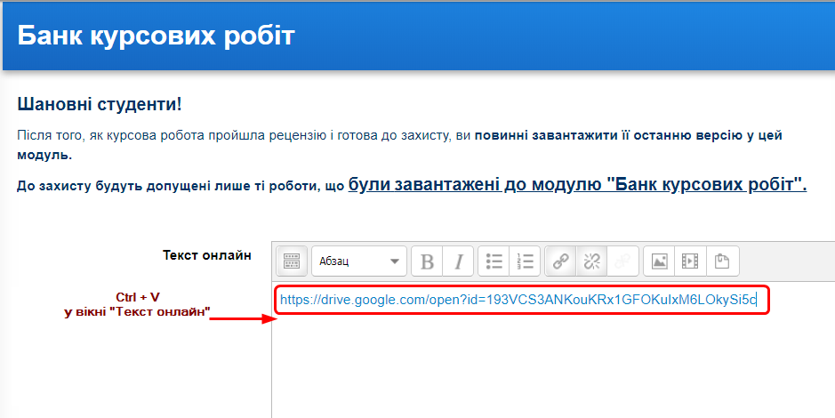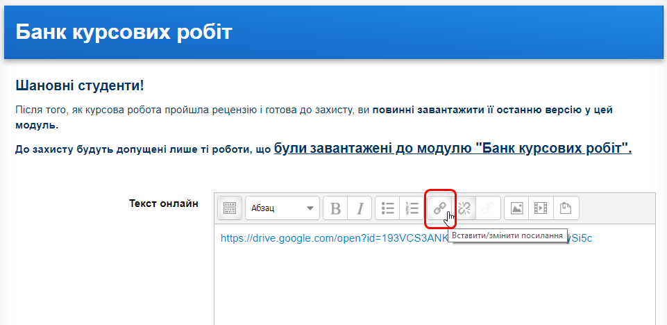 Крок 11. Додаємо веб-посилання на файл курсової роботи у вікні дистанційного курсу "Текст онлайн"