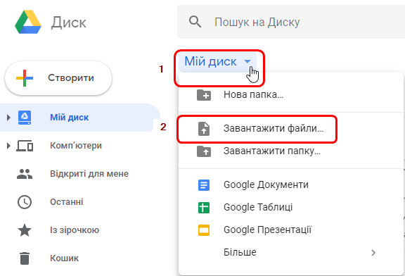 Для цього виконуємо ланцюг команд: натискаємо "Мій диск" > обираємо піктограму "Завантажити файли..."
