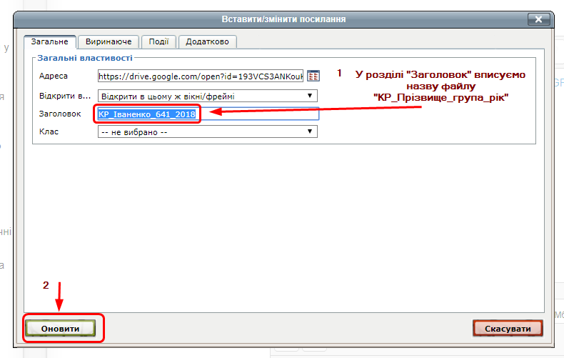 Крок 13. У вікні, що з’явиться вносимо назву файлу [КР_Прізвище_група_рік] до розділу "Заголовок" > натискаємо кнопку "Оновити"